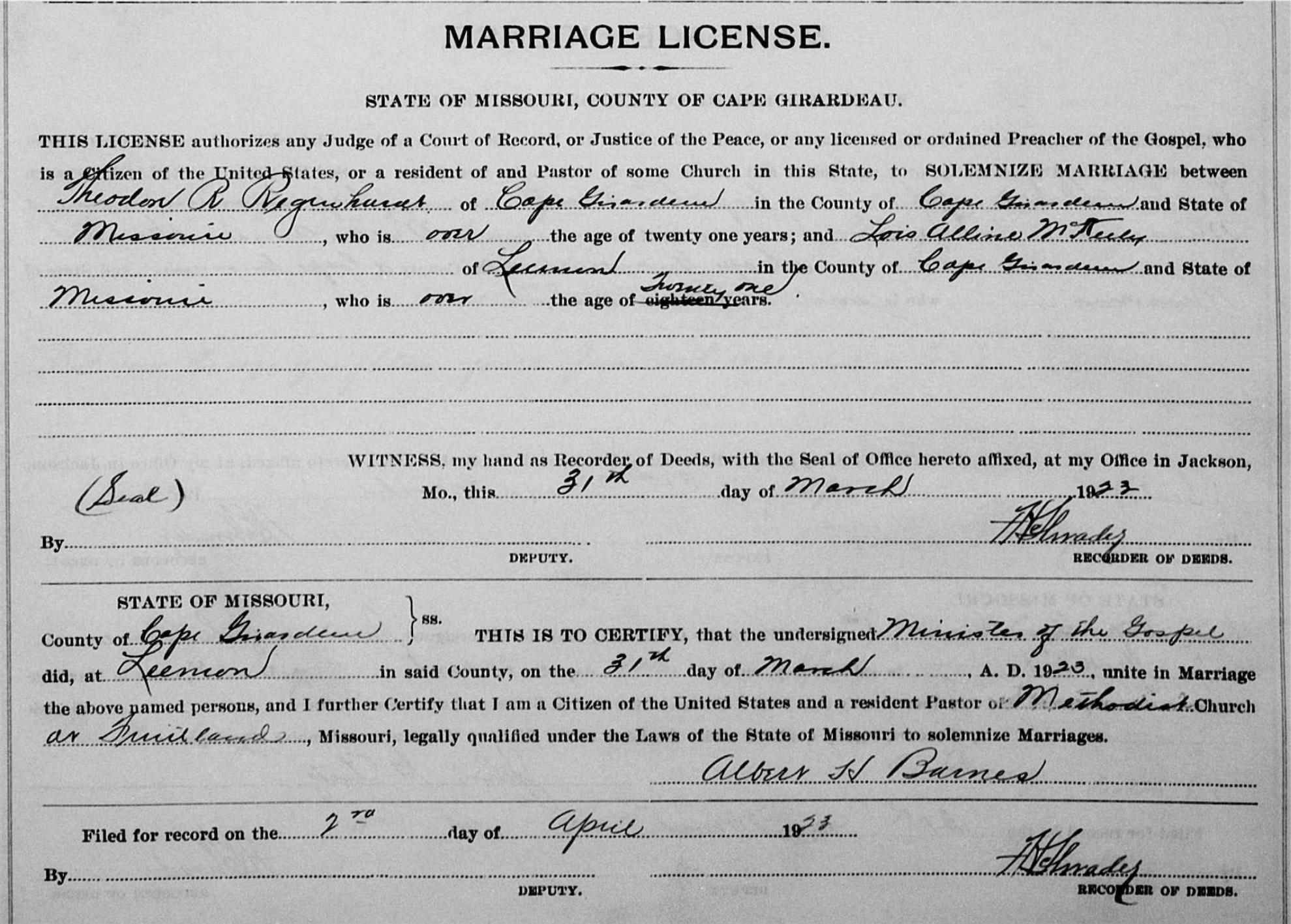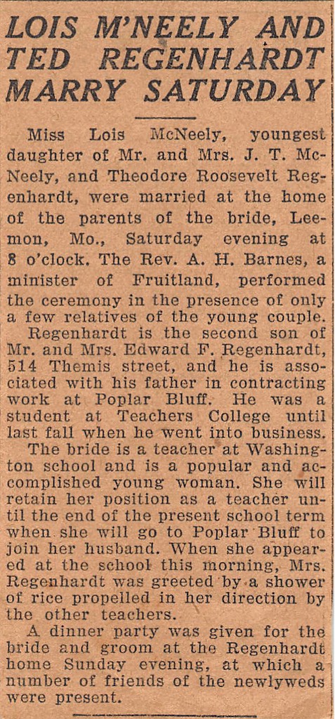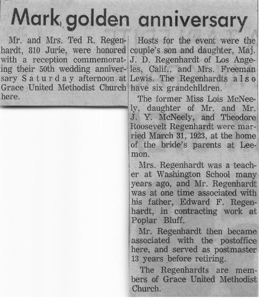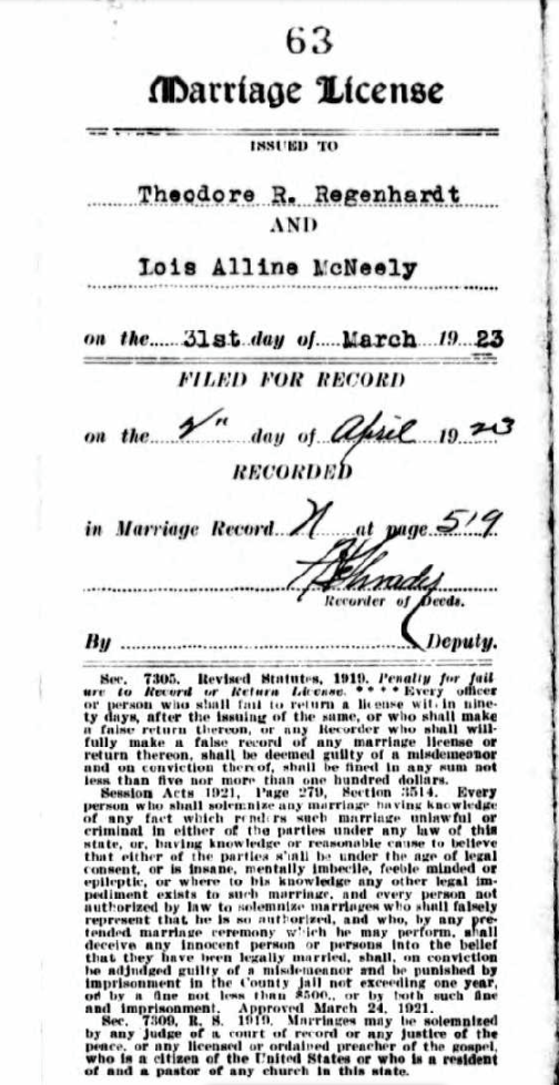 March 31, 2023 was the 100th Anniversary of the marriage of Ted Regenhardt and Lois McNeely.
