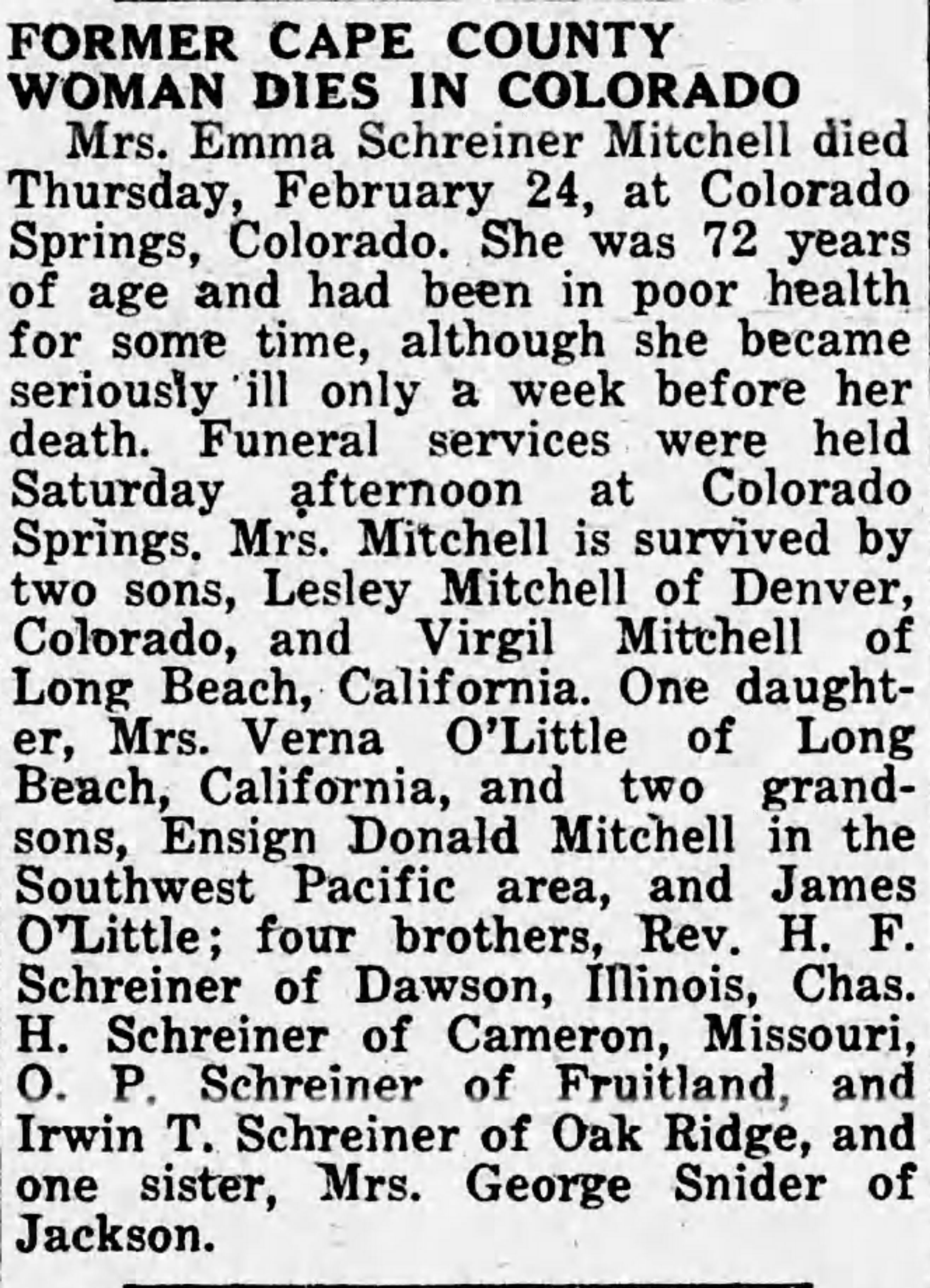 Emma A Weiss nee Kurre Obit SE Missourian 19 Jun 1952 pg 2