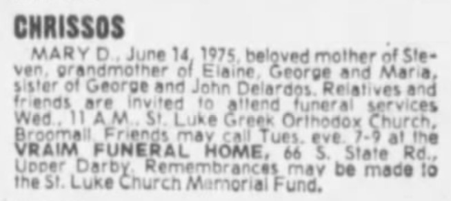 | Mary Delardos Chrissos Obit - The Philadelphia Inquirer 16 Jun 1975 pg 14 col 4