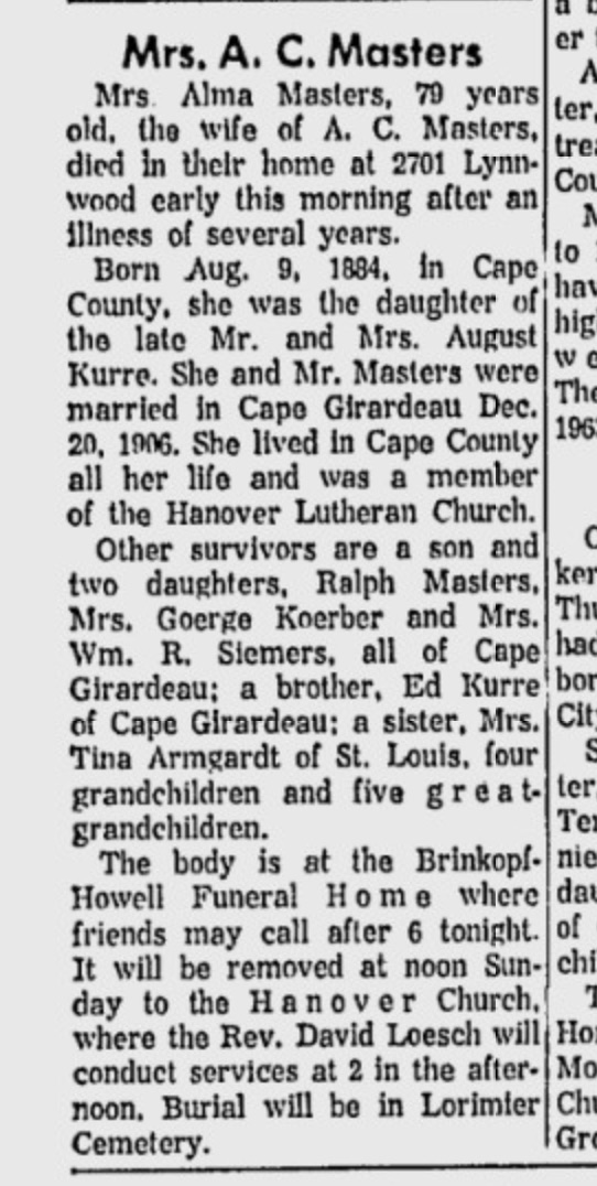 | Mathilda Kurre Masters Obit SE Missourian 28 Feb 1964 pg 2