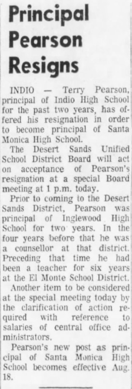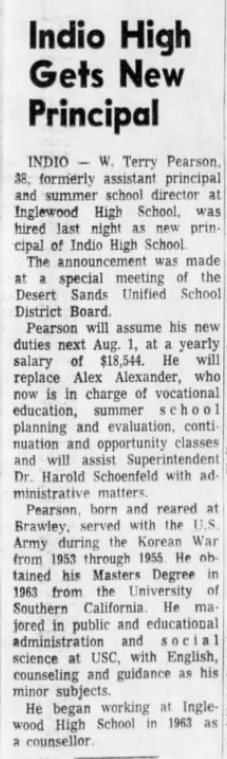 | Terry Pearson Indio High Gets New Principal The Desert Sun 10 jul 1969