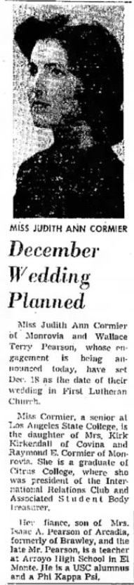 | Terry Pearson-Judith Cormier Wedding announcement - Pasadena Independent 10 Aug 1960 pg 4