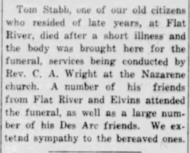 | Tom Stabb Obit (Des Arc) Wayne County Journal-Banner 12 Jan 1928 pg 4