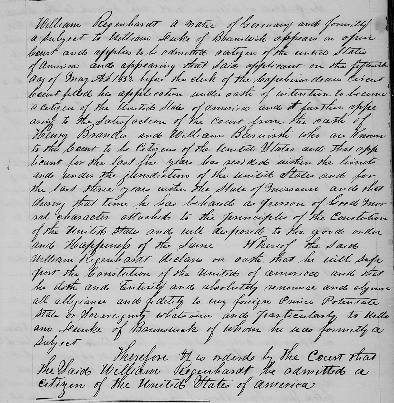 William Regenhardt - Intent to Become a Citizen 15 May 1852