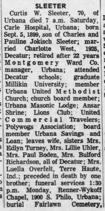 Sleeter Curtis Obit Part 1 of 2 - The Decatur Herald 30 Aug 1970 pg 17 |