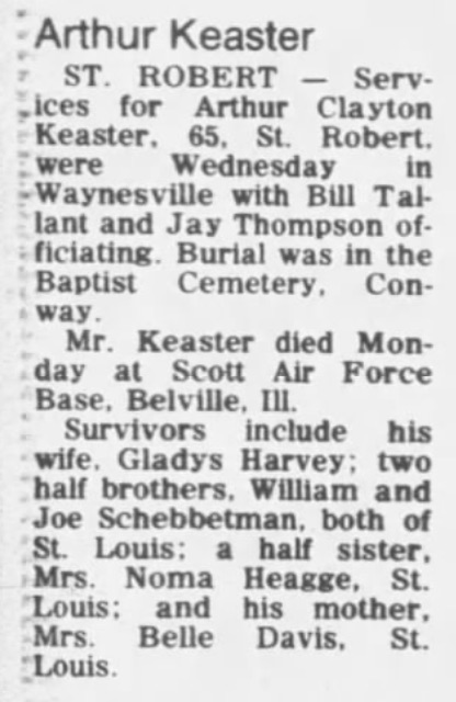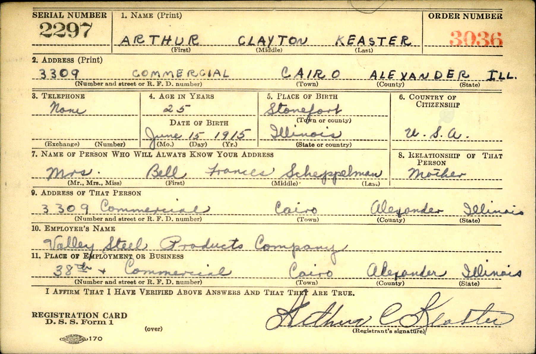 - Father is possibly Arthur Samuel Keaster (b 1 Oct 1891 - ) Living in Stonefort, Williamson County, Illinois