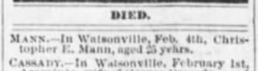 | Death - 4 Feb 1876 - near Watsonville,,Santa Cruz County,California,United States |