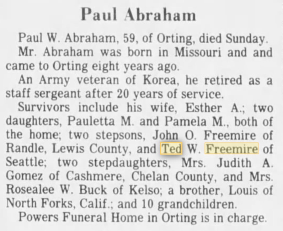 | Photos | Ted Freemire in Paul Abraham Obit News Tribune (Tacoma) 22 Apr 1980 pg 5 | |