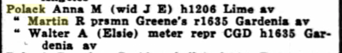 Polack, Walter A, 1635 Gardenia av ………………… repairman, D