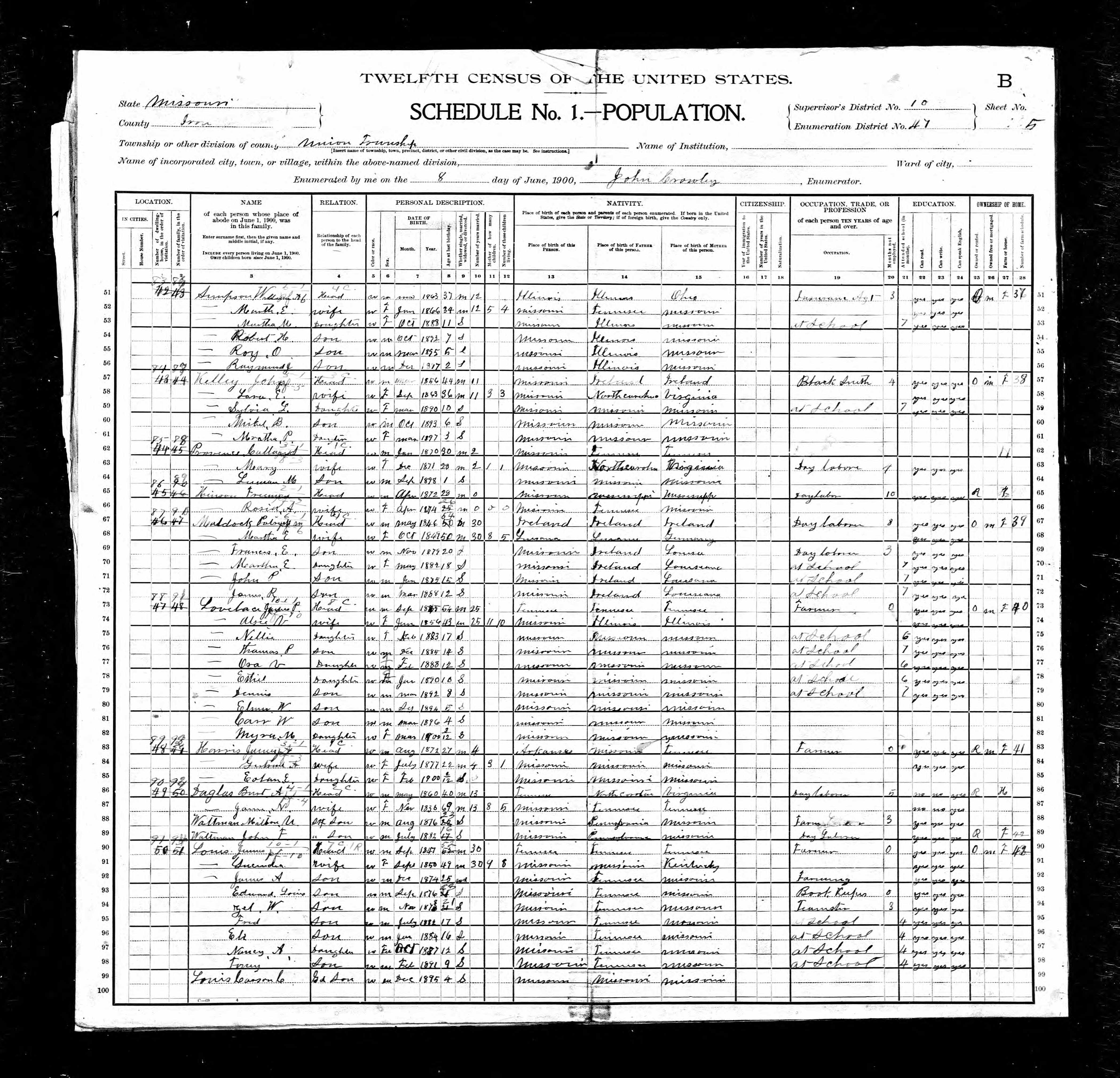 John & Emiline were #497, his age 30, born TN, she was 25, SC, with three sons: Eli, 6, MO, Levi 4, TN, and Libe 2, MO