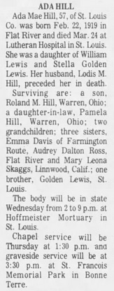 Ada Mae Lewis Hill Obituary The Daily Journel Flat River, MO 30 MAr 1978 pg 11
