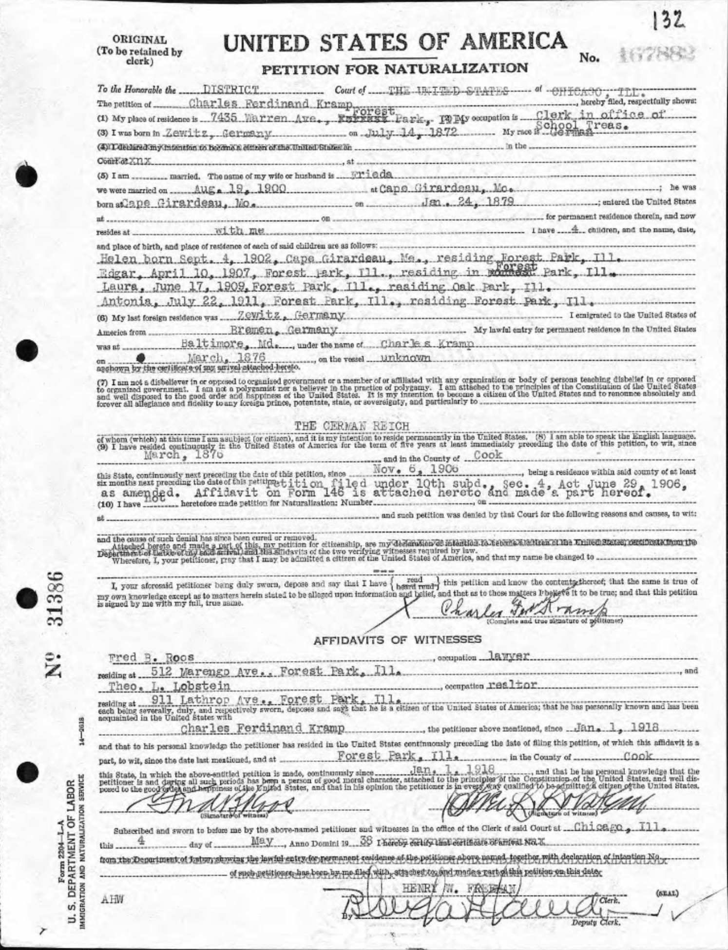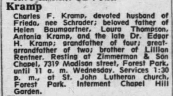 | 2. Dr. Edgar H. Kramp, b. 10 Apr 1907, Forest Park,,Cook County,Illinois,United States d. 10 Jan 1951, Chicago,,Cook County,Illinois,United States (Age 43 years) |