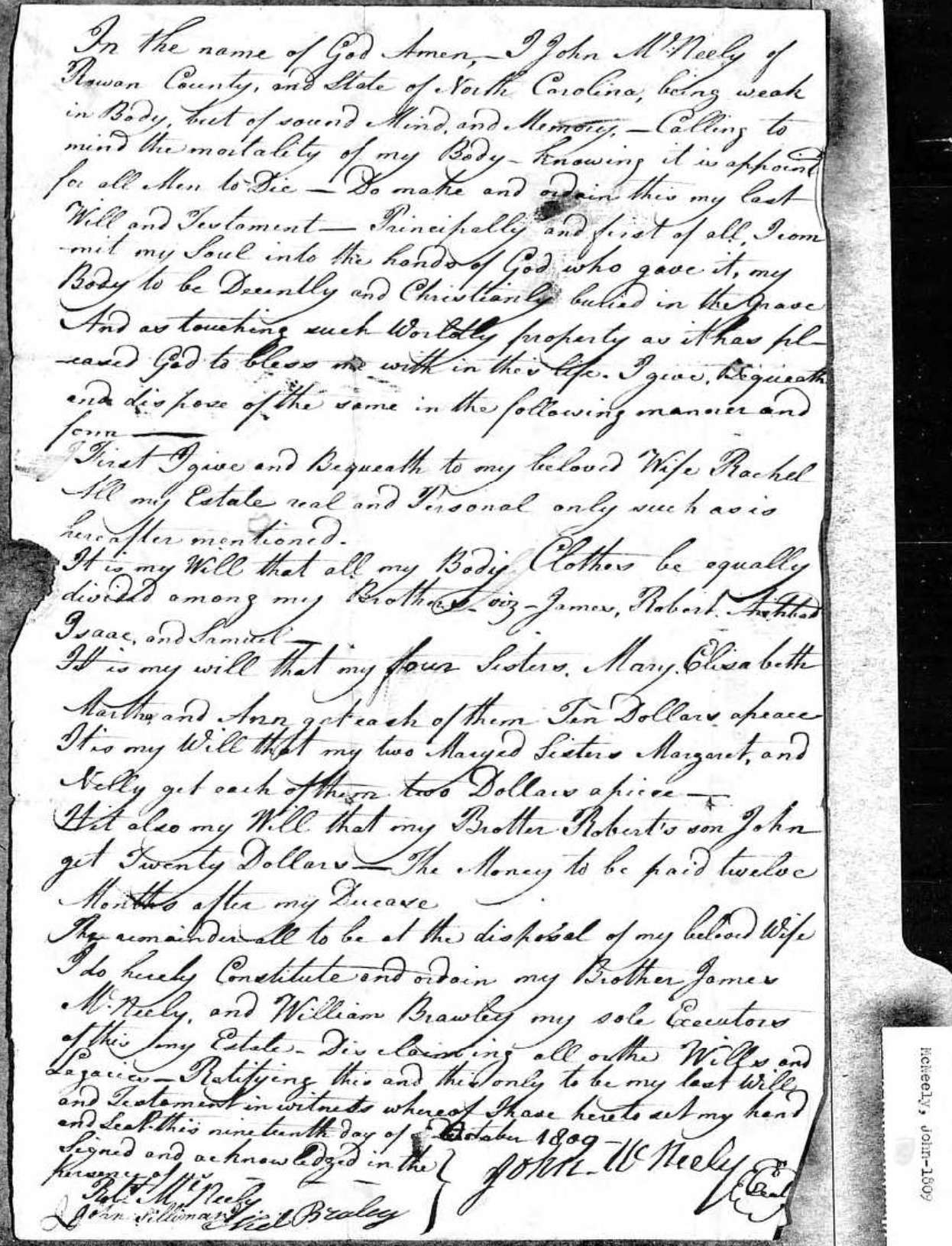 Archibald McNeely, Sr., b. Abt. 1733, ,,Bucks County,Pennsylvania,USA d. 8 Sep 1801, ,,Rowan County,North Carolina,USA (Age 68 years) |