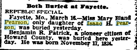 Photos | ![]() | Mary Bland PEarson Ob, dau of Isaac H Perason St Louis Republic 17 Mar 1901 pg 13 |