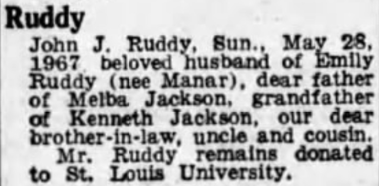 John J Ruddy Obit STL Post-Dispatch 31 May 1967 pg 48 (7E col 3)