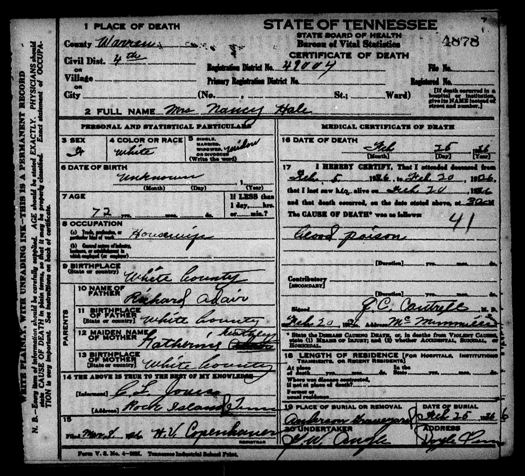 Name: Nancy Hale Event: Death Event Date: 25 Feb 1926 Event Place: Warren, Tennessee Gender: Female Marital Status: Widowed Race or Color: White Age: 72 Estimated Birth Year: 1854 Birth Date: Birthplace: White County Spouse: Father: Richard Adair Father's Birthplace: White County Mother: Katherine Heathley Mother's Birthplace: White County Occupation: Housewife Street Address: Residence: Cemetery: Anderson Graveyard Burial Place: Burial Date: 25 Feb 1926 Informant: Additional Relatives: Digital Folder Number: 4183286 Image Number: 2387 Film Number: 1876711 Volume/Page/Certificate Number: cn 4878