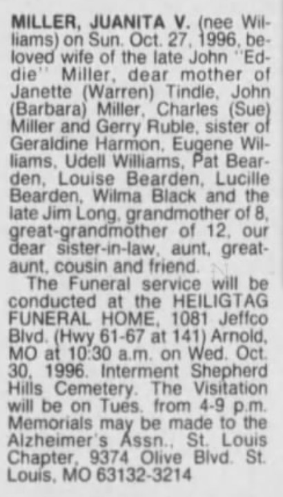 Juanita V Miller nee Williams STL Post-Dispatch 29 Oct 1996 pg 11
