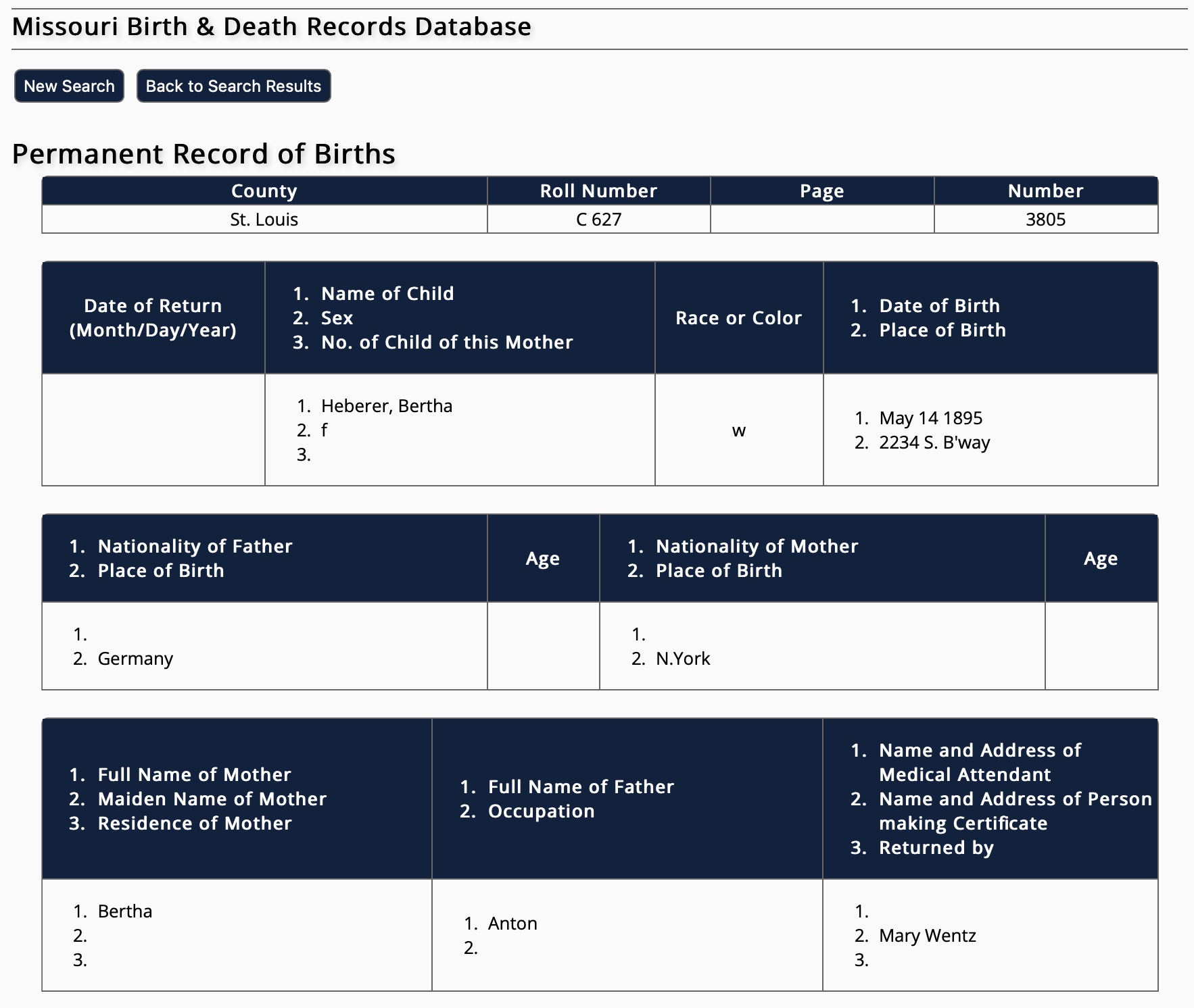 | Birth - Address: 2234 S. Broadway - 16 May 1895 - St. Louis,,(City of St. Louis),Missouri,USA |