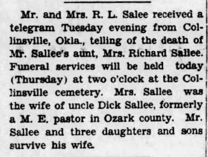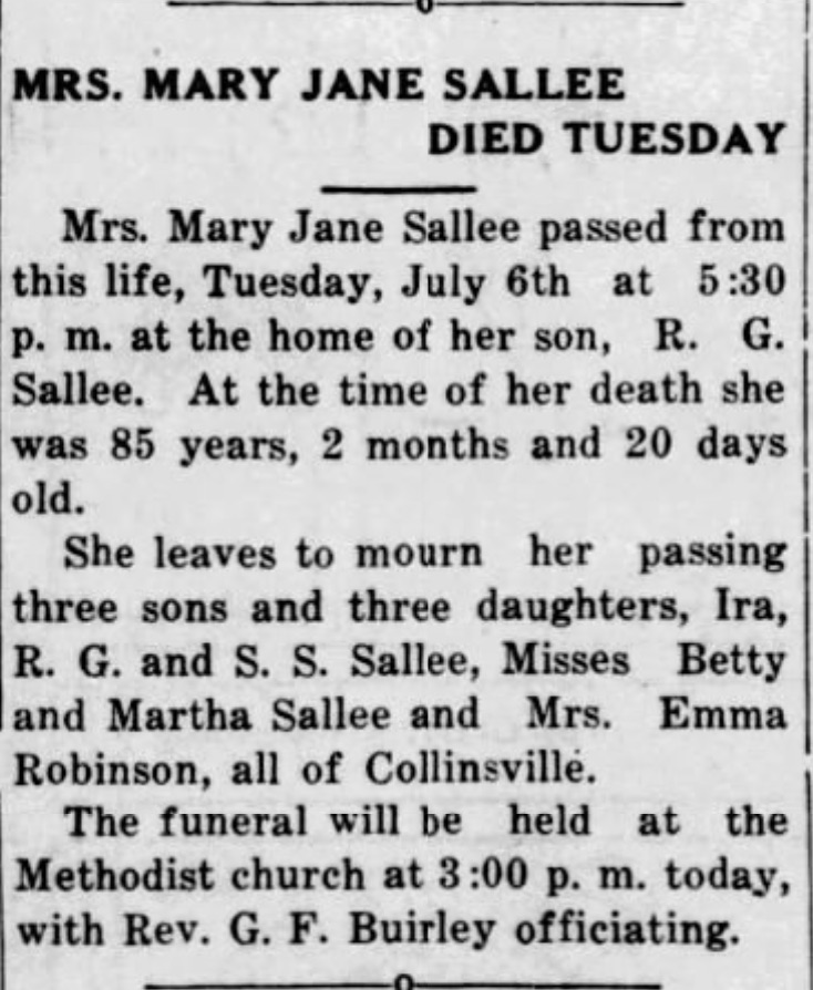 Mary Jane Sallee nee Griffith Obit - The Collinnville News - 9 Jul 1936 Thurs, Pg 1 col 2