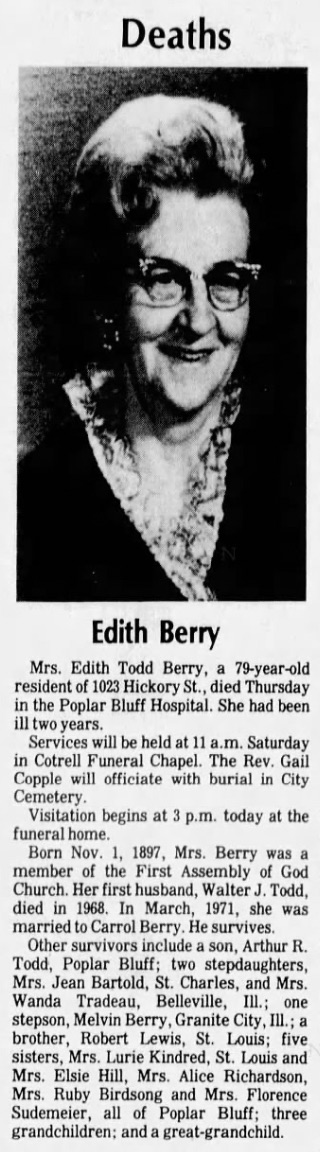 Edit Lewis Todd Berry nee Lewis Obit Daily American Rebublic (Poplar Bluff) pg 15 col 2