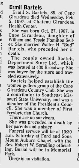 Ermil Seiler Bartels Obit SE M1ssourian 7 Feb 1997 pg 4b