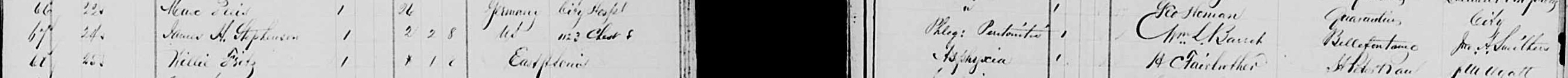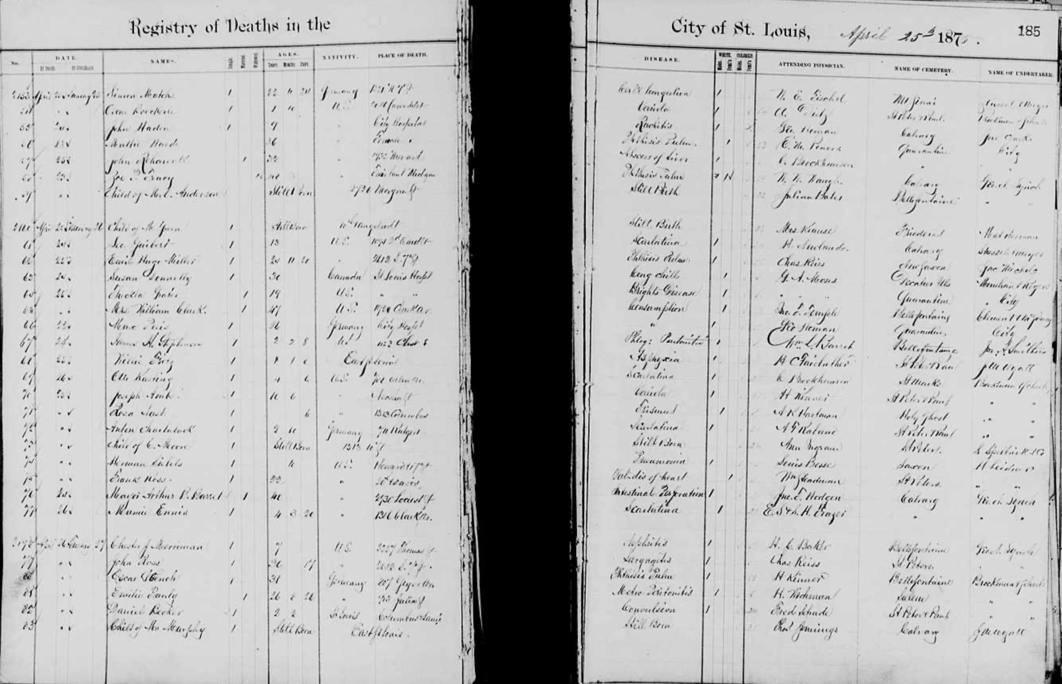 - St. Louis Death Registry: Pg 184 - 185 entry 67: DOD 24 Apr 1875 - age 2 yrs 2 mos 8 days of Peratonitis. familysearch.org film 008200185 image 203.