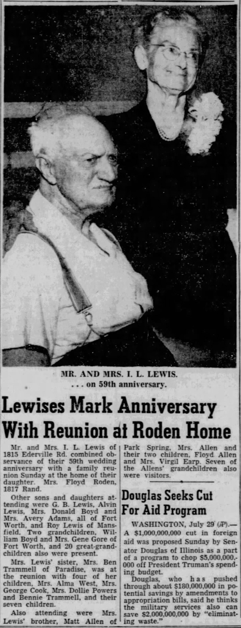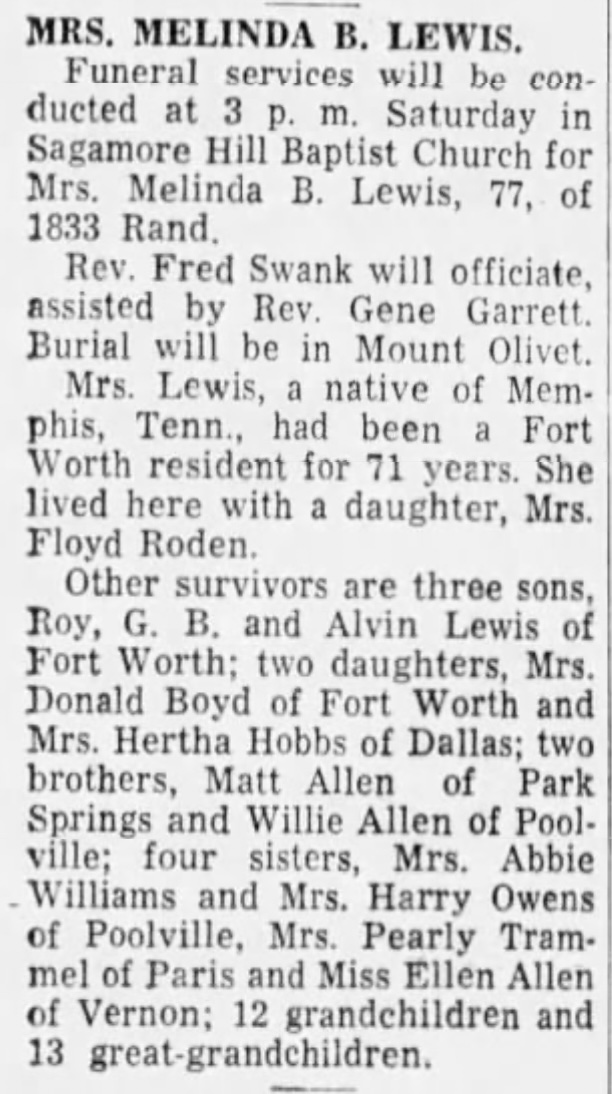 | 1. Della Emma Lee Lewis, b. 30 Sep 1893, Kennedale,,Tarrant County,Texas,United States d. 29 Nov 1971, Fort Worth,,Tarrant County,Texas,United States (Age 78 years) |