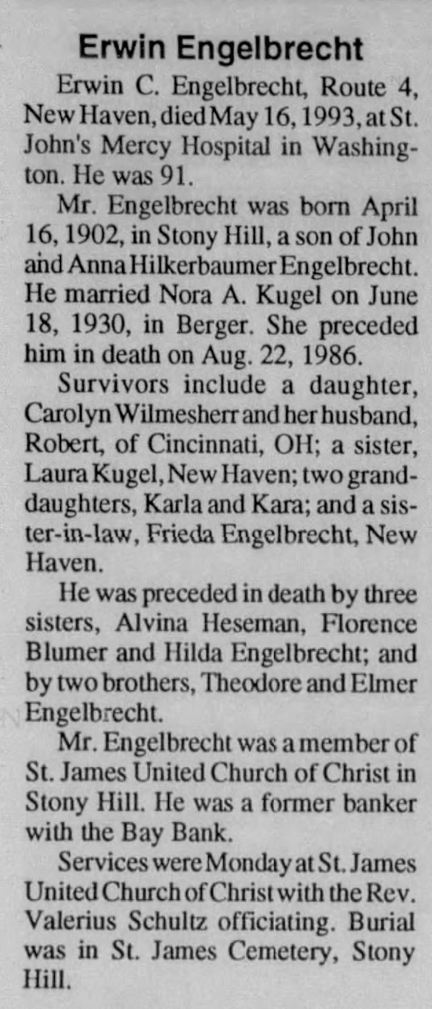 Mr. Engelbrecht was born at Stony Hill, April 16, 1902, a son of John and Anna Hilkerbaumer Engelbrecht. He was married at Berger, June 18, 1930, to Nora A. Kugel, who preceded him in death in 1986.