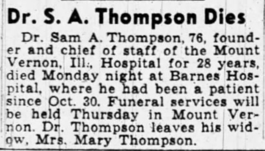 - SAM A. THOMPSON, M. D. For fifteen years a practicing physician and surgeon in Southern Illinois and since June, 1911, a resident of Mount Vernon, Dr. Thompson is a wholesale example of what may be accomplished by a man in the way of advancement when he is the possessor of a legitimate ambition, with the determination and ability to supplement that ambition. Beginning life with merely a common school education, Dr. Thompson when a boy of sixteen began to work with the intention of ultimatelycontinuing his studies as a result of his labors, to the end that he might later become a member of that profession to which he aspired, and whose ranks he has graced through fifteen years of careful and efficient service.