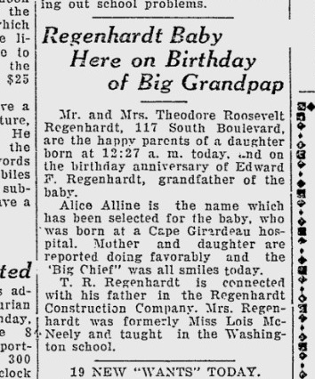 Theodore Roosevelt Regenhardt, b. 26 Dec 1900, Cape Girardeau,,Cape Girardeau County,Missouri,USA d. 30 Oct 1974, Cape Girardeau,,Cape Girardeau County,Missouri,USA (Age 73 years) |