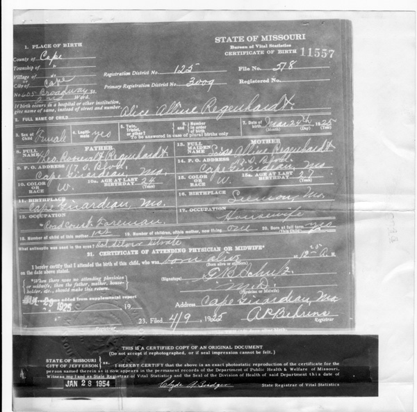 Alice was born March 24, 1925 to Lois Alline (nee McNeely) and Ted R. Regenhardt in Cape Girardeau.