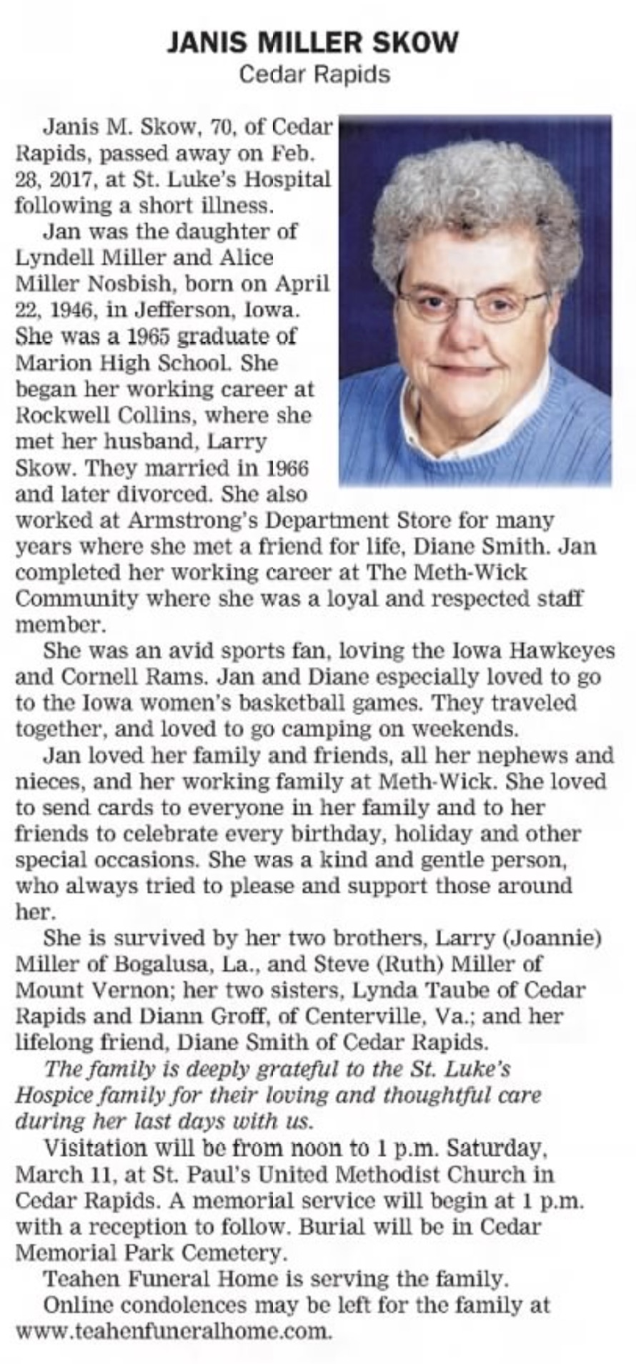 Janis Skow nee Miller Obit - The Gazette (Cedar Rapids Iowas 5 Mar 2017 pg P7