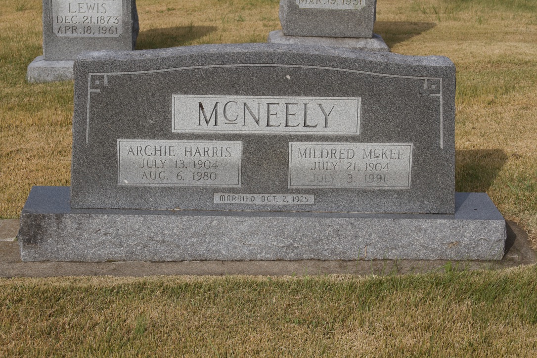 Archibald "Archie" Harris McNeely, b. 13 Jul 1904, Ridgeway,,Hopkins County,Texas,United States d. 6 Aug 1980, Cape Girardeau,,Cape Girardeau County,Missouri,USA (Age 76 years) |