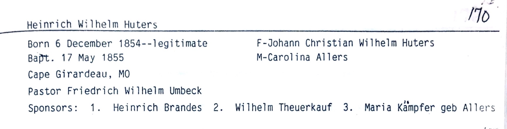 | | 1. Arthur Theodore Wilhelm Huters, b. 1880, Cape Girardeau,,Cape Girardeau County,Missouri,USA d. 1881, Cape Girardeau,,Cape Girardeau County,Missouri,USA (Age 1 year) |