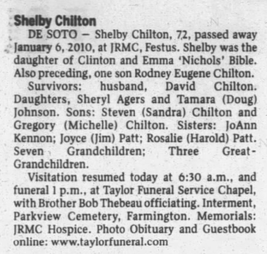 Survivors Include : her husband, David E. Chilton, of DeSoto; 2 Daughters: Sheryl Ann Agers, of Rancho Cucamonga, CA; & Tamara Kay Johnson, of Ventura, CA. 2 Sons: Steven Wayne (& Sandra) Chilton, of Festus & Gregory Scott (& Michelle) Chilton, of DeSoto. 3 Sisters: Jo Ann Kennon, of Longmont, CO; Joyce 'Mrs. Jim' Patt, of Witton, Ark & Rosalie 'Mrs. Harold' Patt, of Ashdown, Ark.