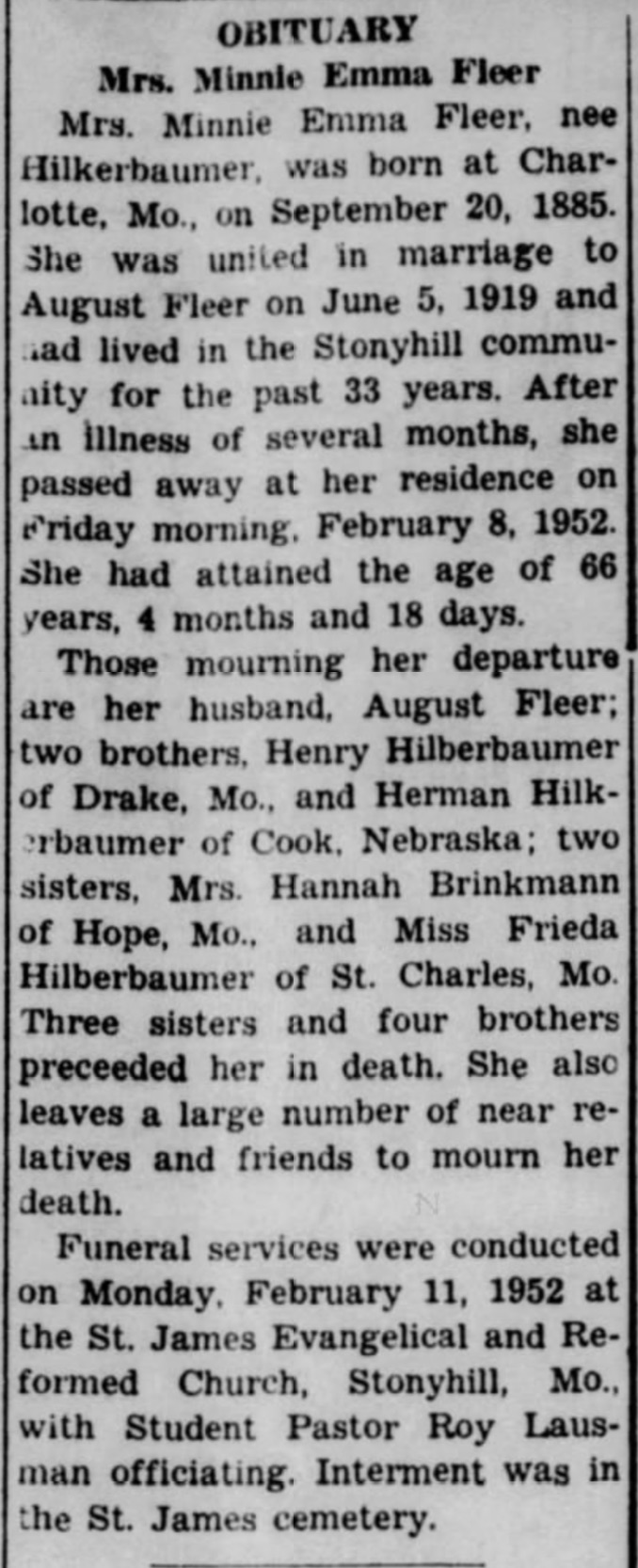 Fleer, Minnie Emma nee Hilkerbaumer Obit The New Haven Leader 14 Feb 1952 pg 8