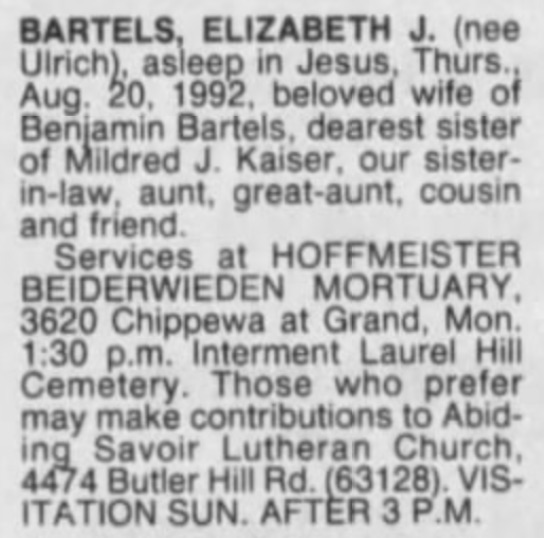 Elizabeth Bartels nee Ulrich Obit STL Post-Dispatch 23 Aug 1992 pg 9D (19)