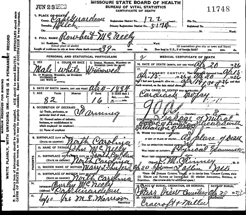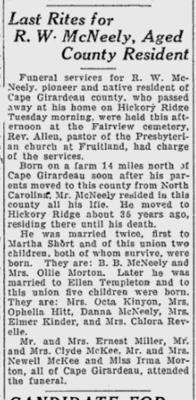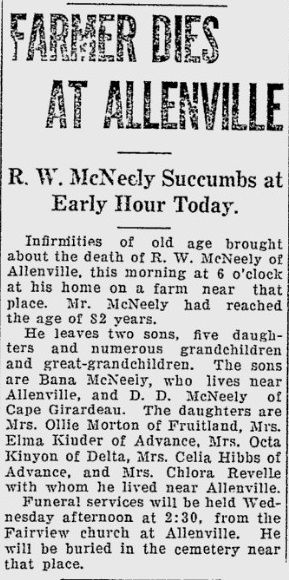 He leaves two sons, five daughters and numerous grandchildren and great-grandchildren. The sons are Bana McNeely, who lives near Allenville, and D. D. McNeely of Cape Girardeau. The daughters are Mrs. Ollie Morton of Fruitland, Mrs. Elma Kinder of Advance, Mrs. Octa Kinyon of Delta, Mrs. Celia Hibbs of Advance, and Mrs. Chlora Revelle with whom he lived near Allenville.