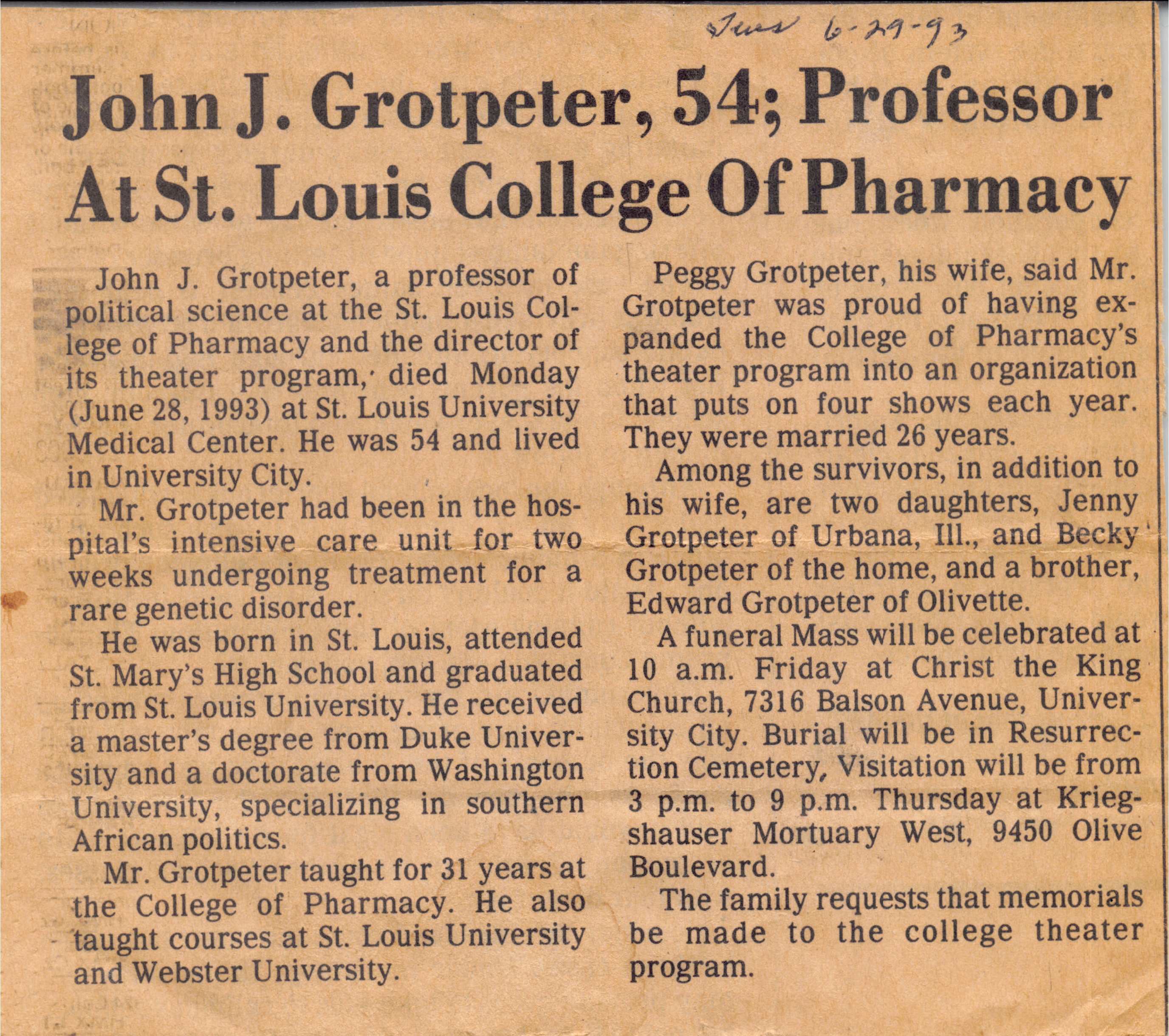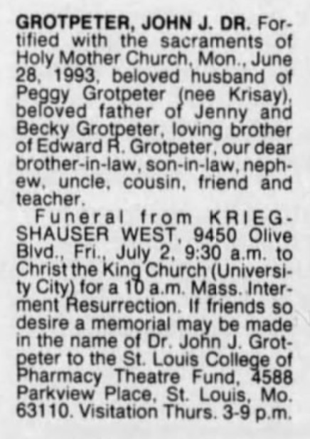 Grotpeter, John Dr. STL Post Dispatch 30 Jun 1993 pg 48 |