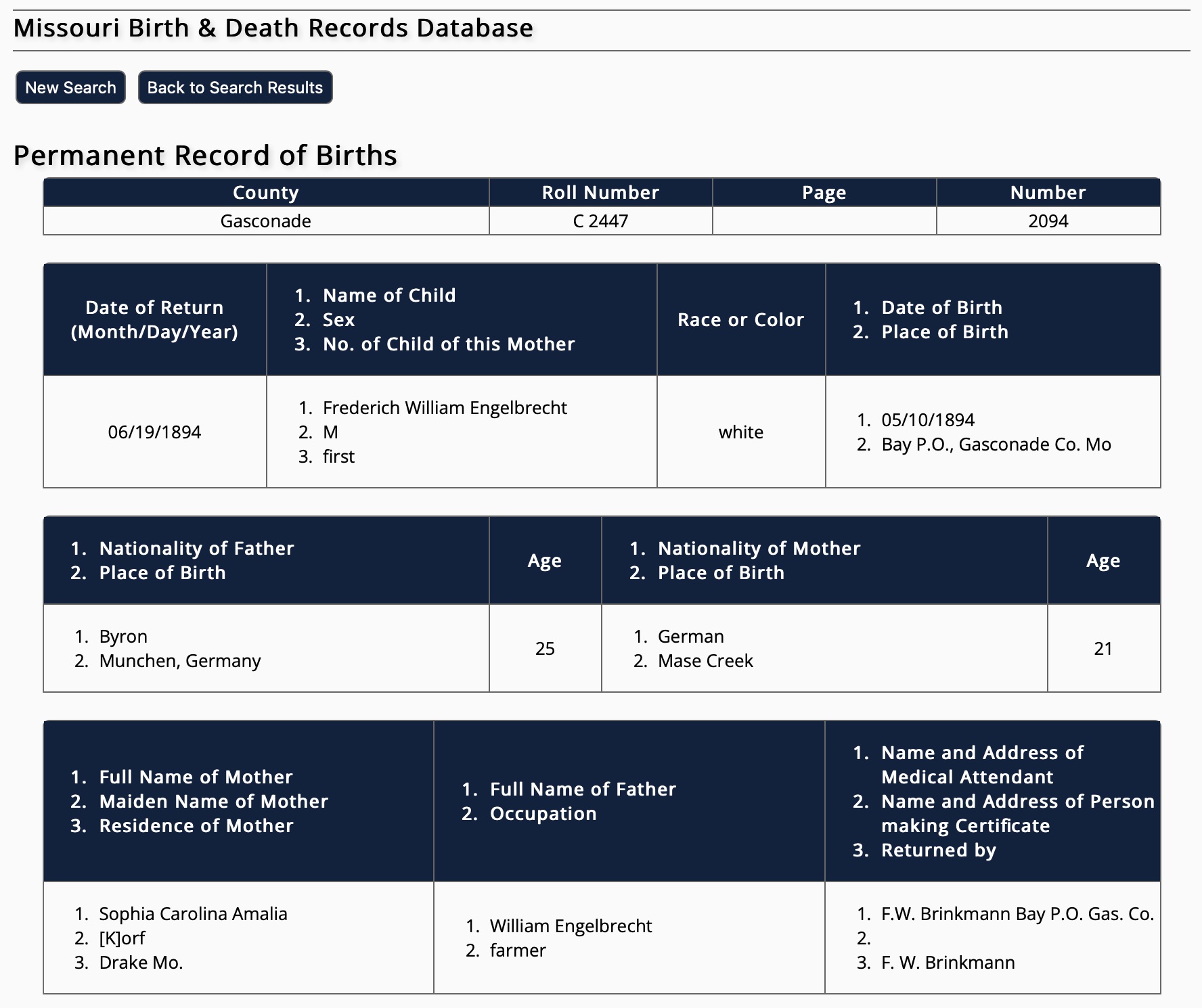 Frederich William Engelbrecht Birth Record 10 May 1894 |