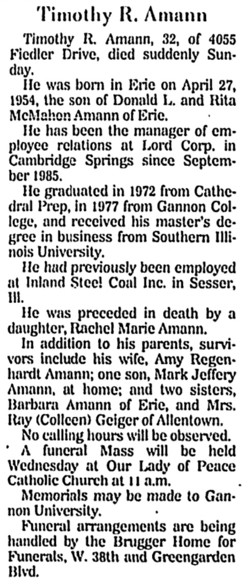 Timothy Amann Obit Erie Morning Dispatch (Erie,PA) 28 Apr 1987 pg 10 col 2