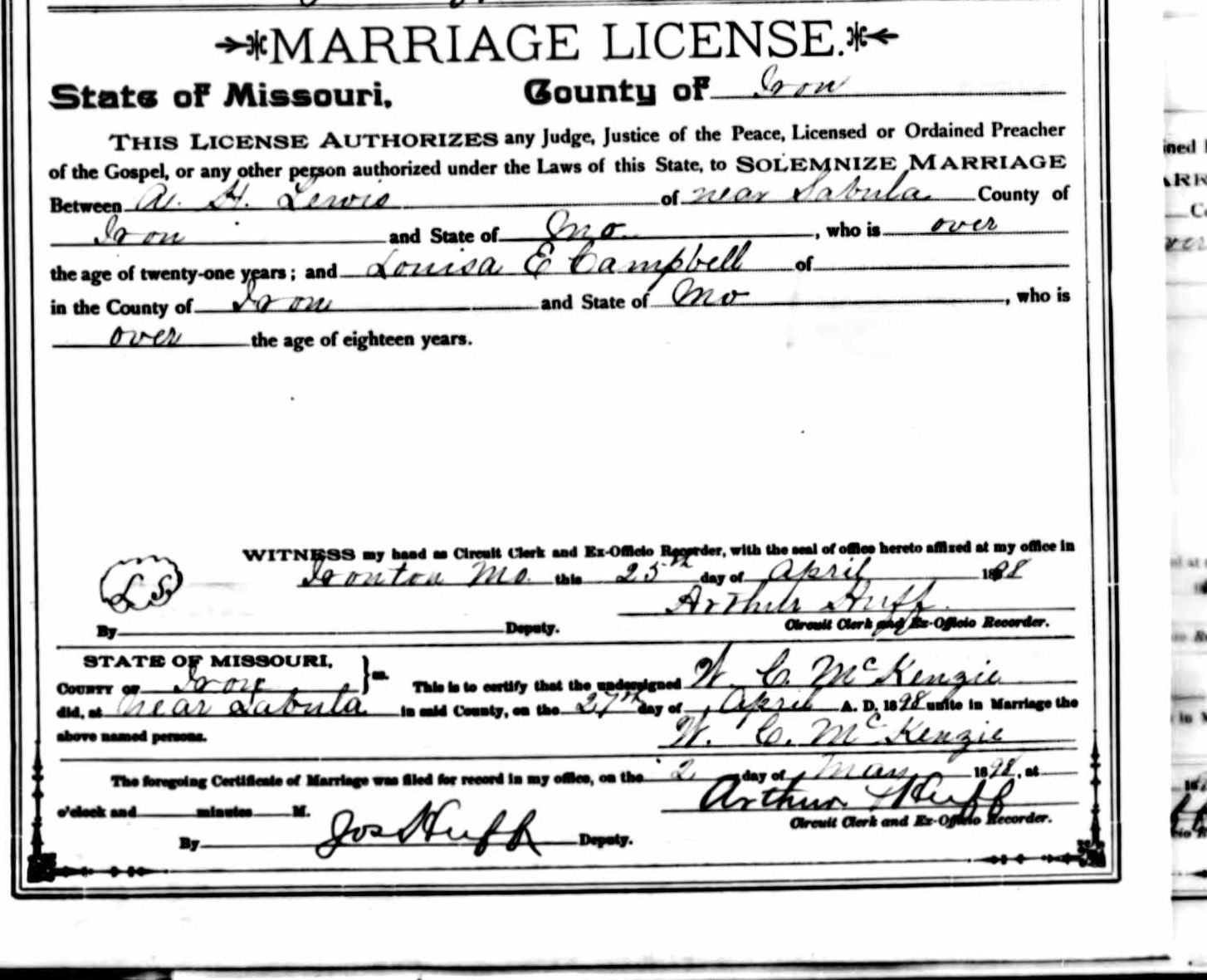 | | 5. Orville Leslie Lewis, b. 26 Dec 1911, Carver Creek Community,,Iron County,Missouri,USA d. 15 Feb 1985, Pilot Knob,,Iron County,Missouri,United States (Age 73 years) |
