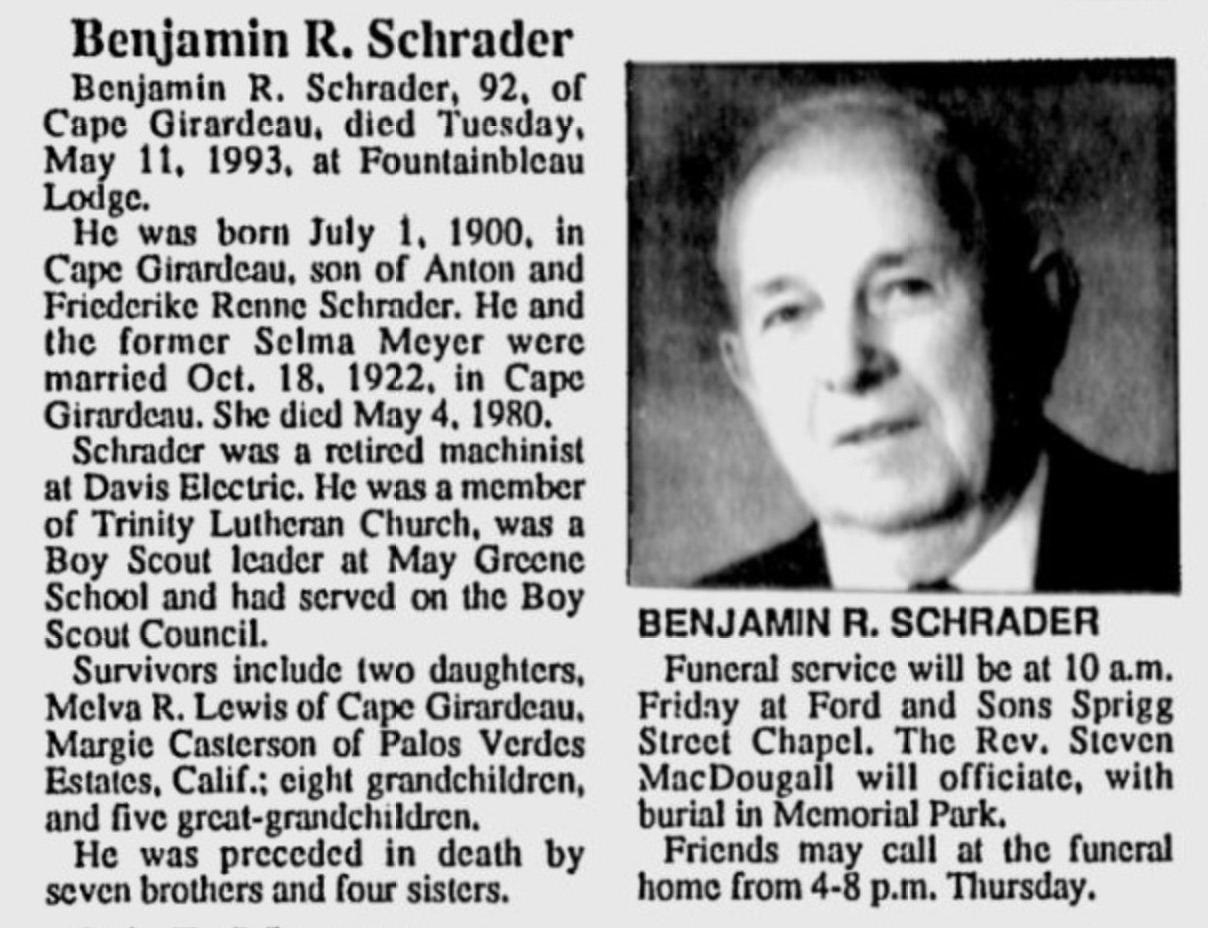 Benjamin Schrader Obit SE Missourian 12 May 1993 pg 8A |
