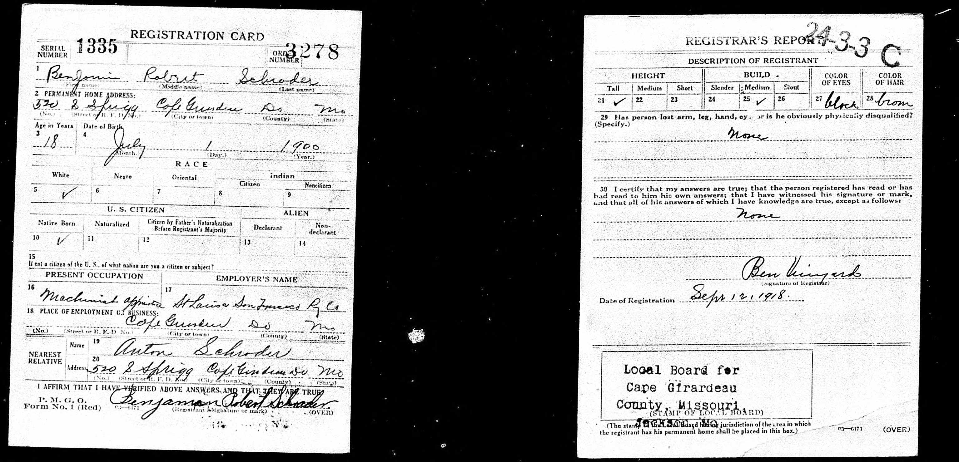 Photos | ![]() | Ben Schrader WWI Draft Registration |