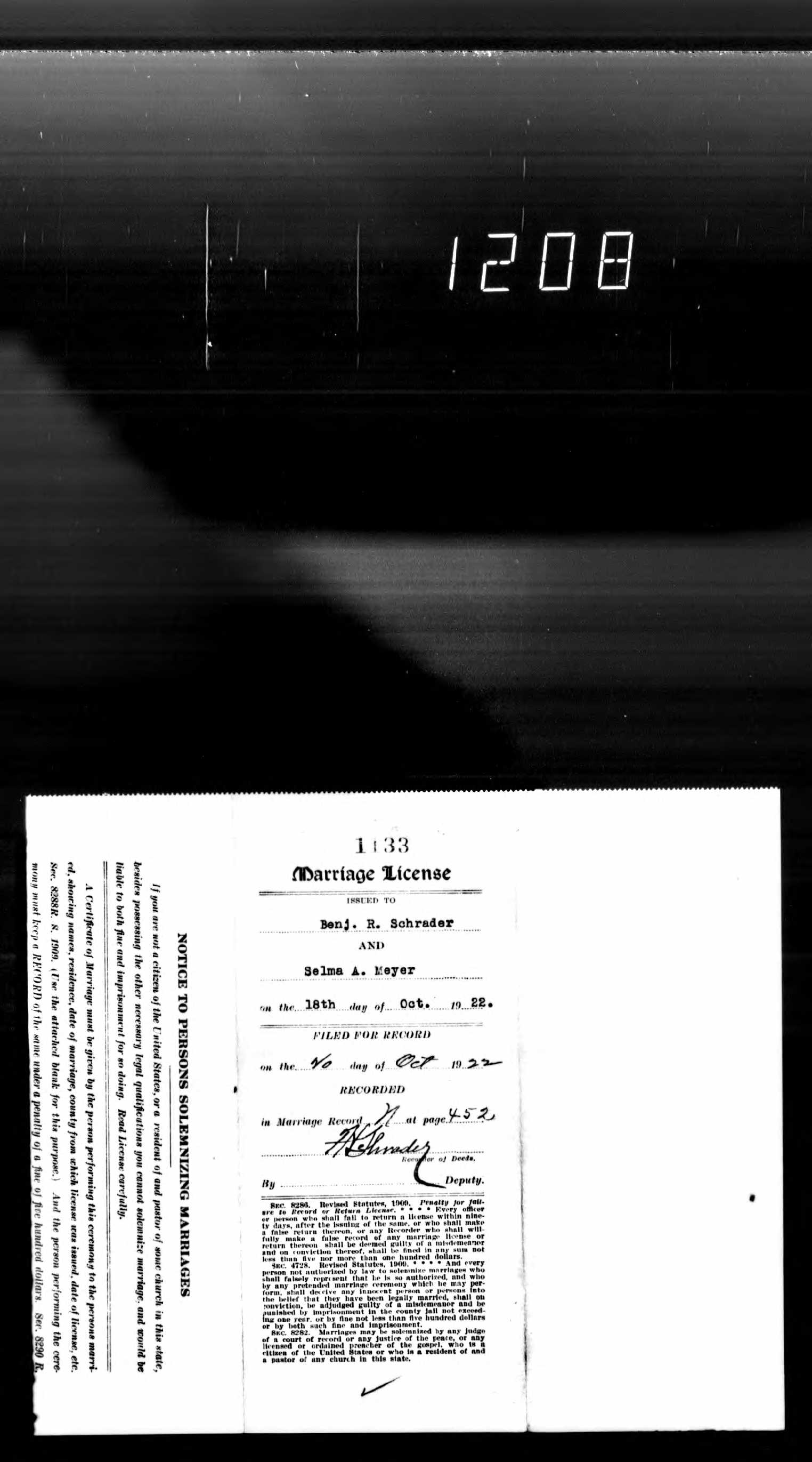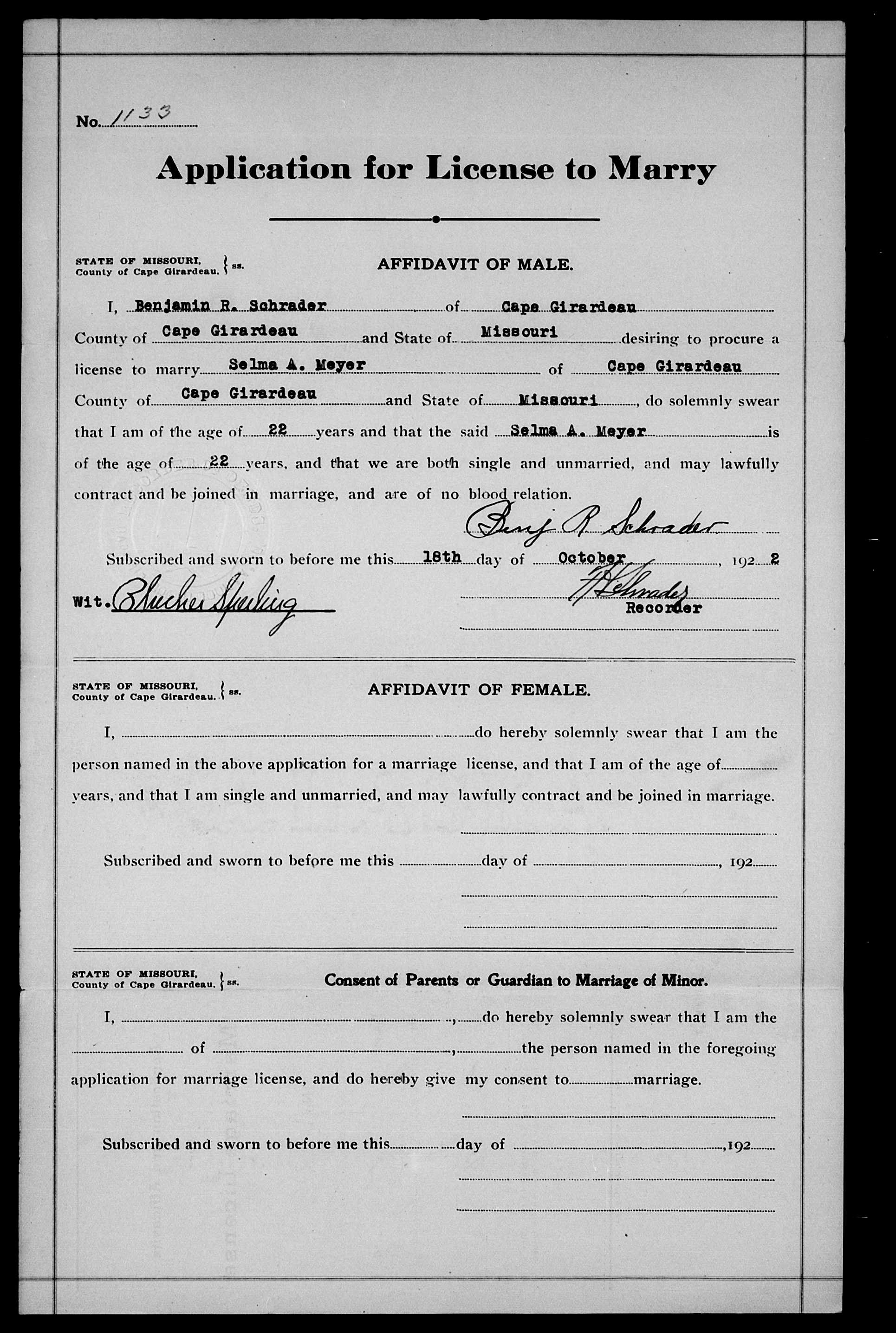 Ben Schrader to Selma Meyer Marriage License |