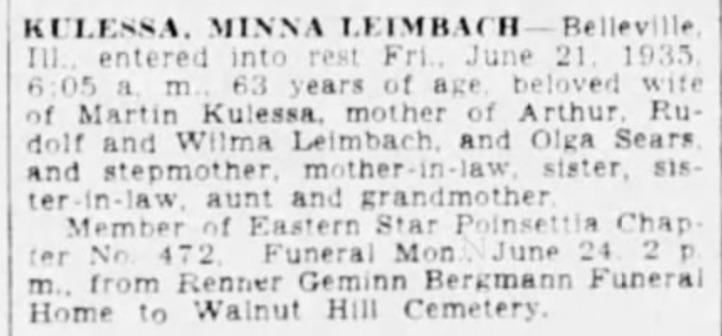 Kulessa, Minna Leimbach Obit STL Post Dispatch 21 Jun 1935 pg 33 |