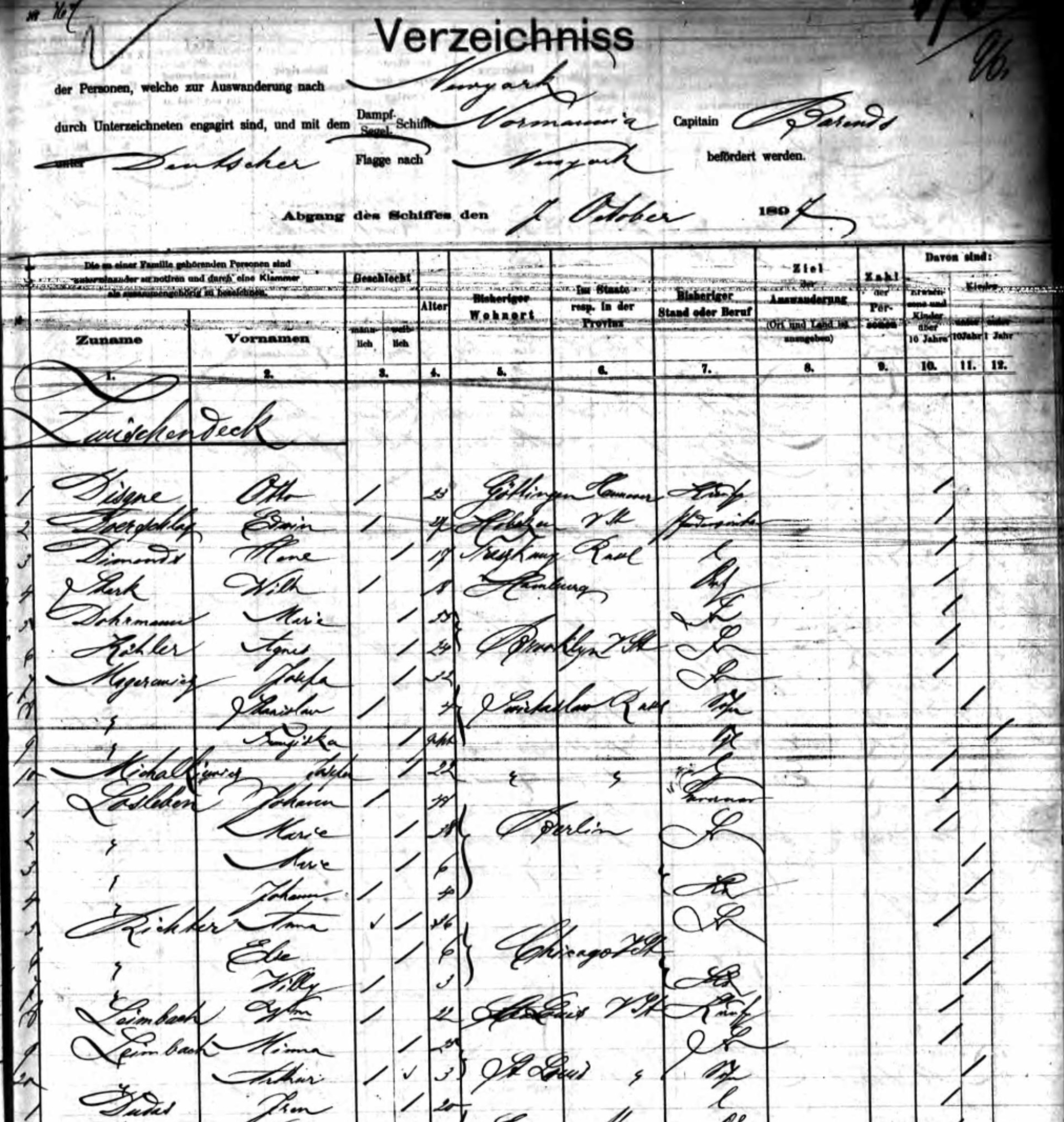 Photos | ![]() | Leimbach, Wm, Mina, Arthur Ship Passenger list. #8, 9, and 10 near bottom of list. William is brother of Min's husband Rudolph. Arthur is her son. |