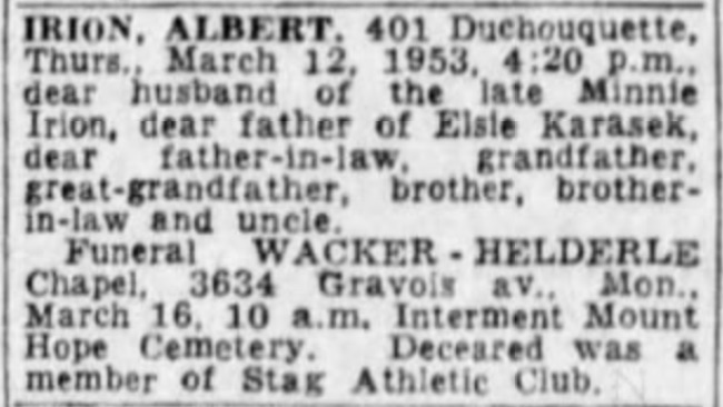 Albert Irion Obit STL Post-Dispatch 15 Mar 1953 pg 41 (1D) col 6