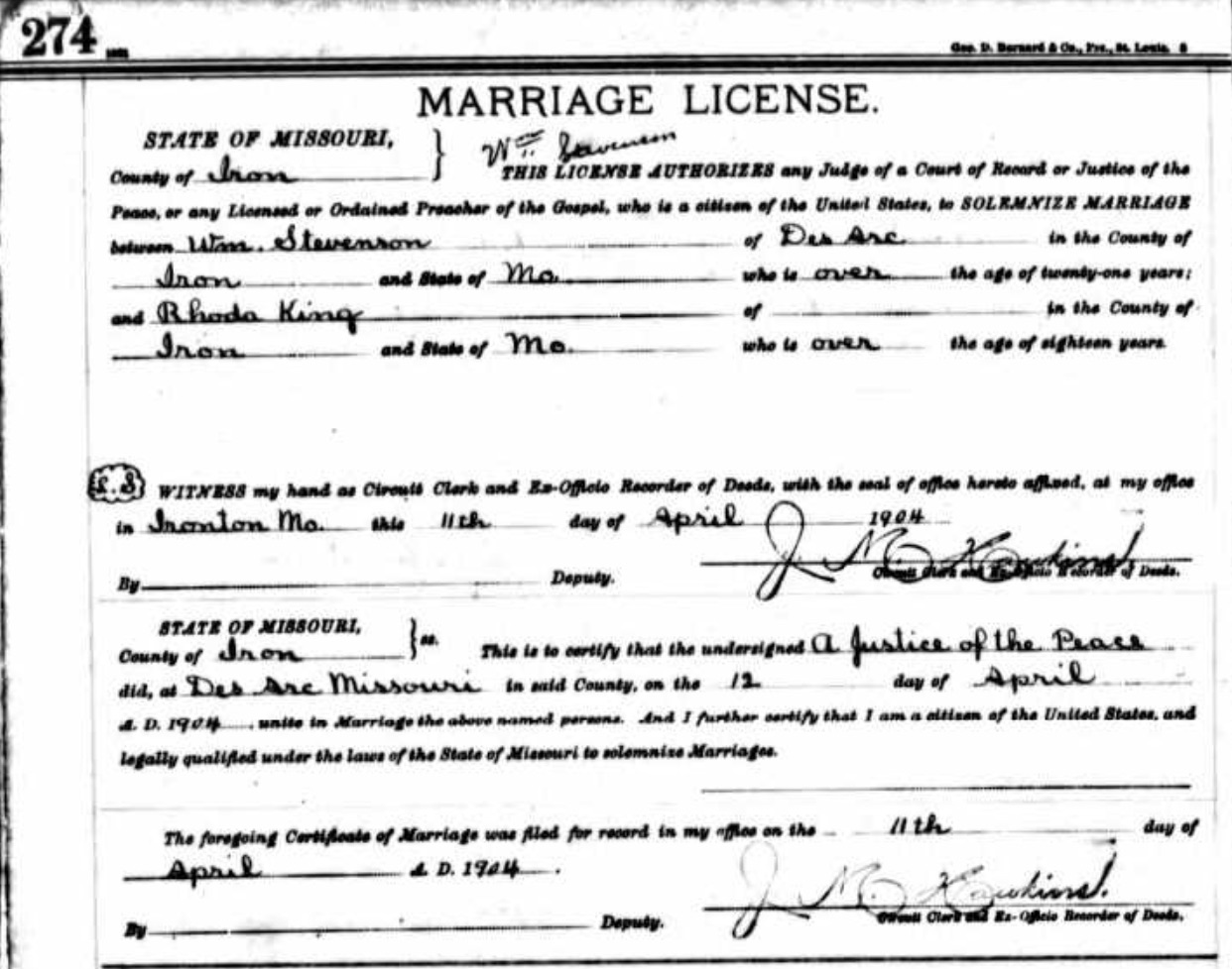 After Molly died, William remarried to Rhoda Permelia King (1883-1959) on 12 Apr 1904 at Des Arc, Iron County, Missouri. William and Rhoda were the parents of two known children, namely:
