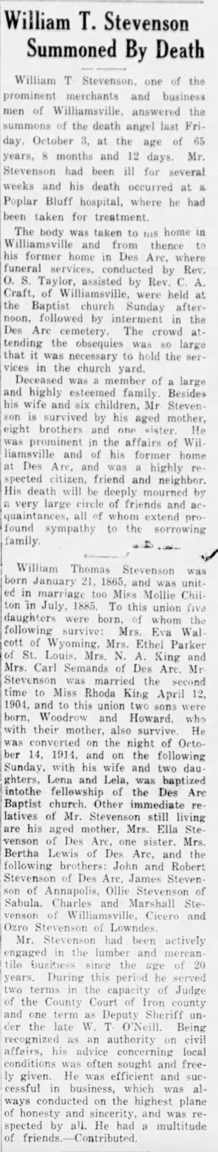 WILLIAM T. STEVENSON. An able exponent of the progressive spirit and strong initiative ability that have caused Iron county to forge so rapidly forward commercially and in other lines is William T. Stevenson, who has done much for the material and civic development and upbuilding of the attractive town in which he has elected to establish his home. Mr. Stevenson is a man of great and diverse activity. He is engaged in the general merchandise business at Des Arc; he is a member of the firm of William Stevenson & Brothers, who conduct a general store at Scatterville, Wayne county; he owns the Des Arc Telephone Company, and in fact is one of the most prominent telephone men in this part of the state; he is vice president of the Bank of Des Arc and former president of this sound monetary institution; and he has given excellent service in public office. It is by no means to be gainsaid that he is one of the big men of Iron county. He built the Des Arc telephone system and he has Bell and other long distanc